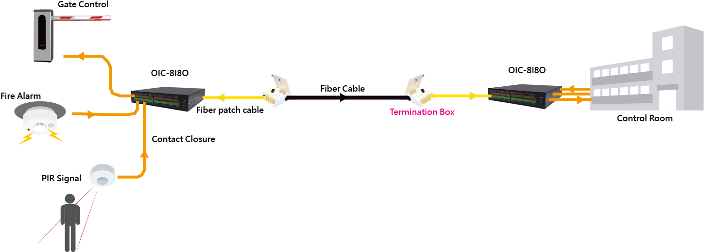 The OIC-8I8O is designed to enable customers to get the highest performance at the lowest budget, and to fully cooperate with all types of dry contact trigger devices on the building automation and environmental control market. Including the application of alarm triggering, PIR signal transmission, fire alarm systems, traffic signal control or gate control. This series support both dry contact and non-dry contact signals. This model provides transmission of 8 independent input signals over fiber optic cable and each unit features NC/NO/GND contact for system monitoring.